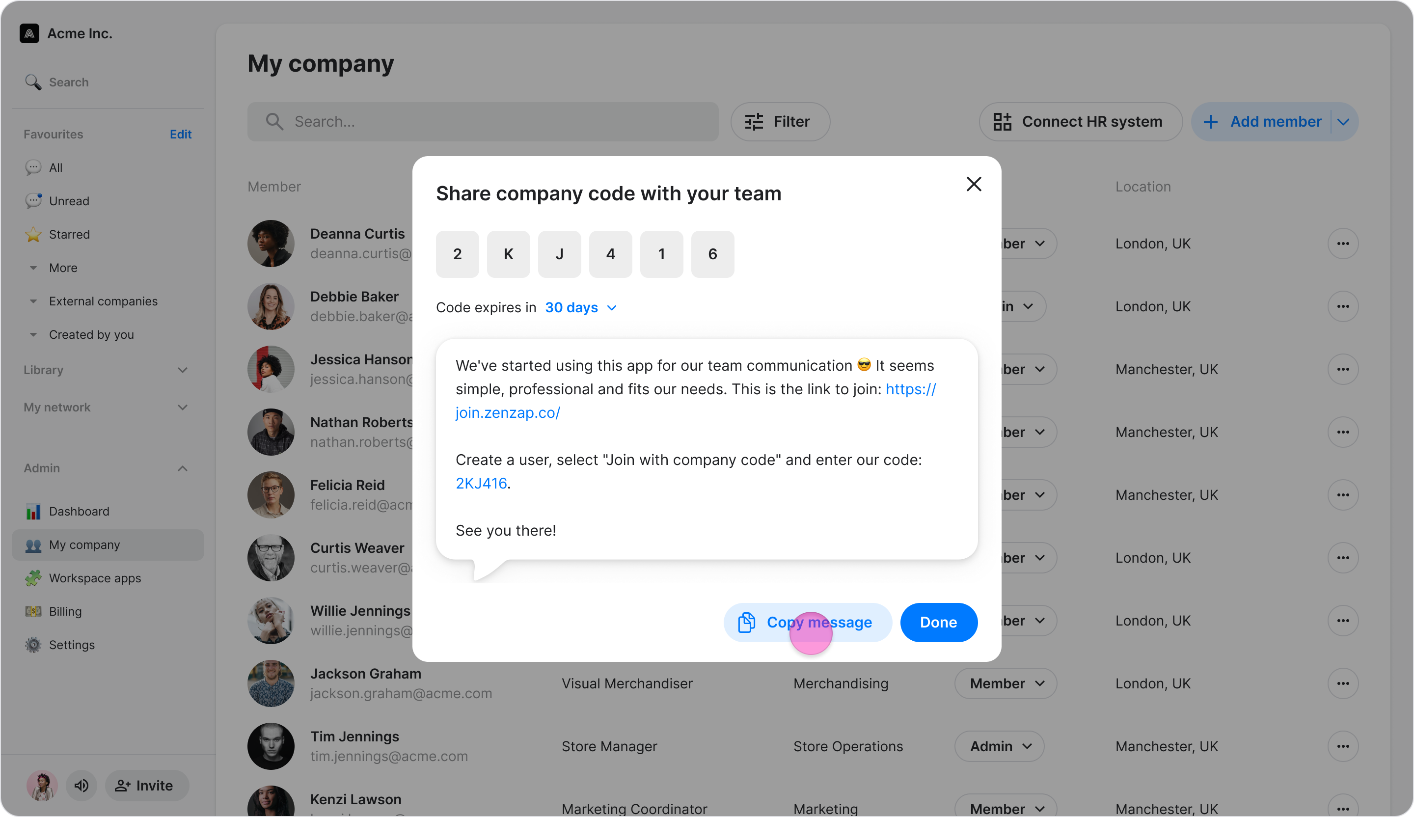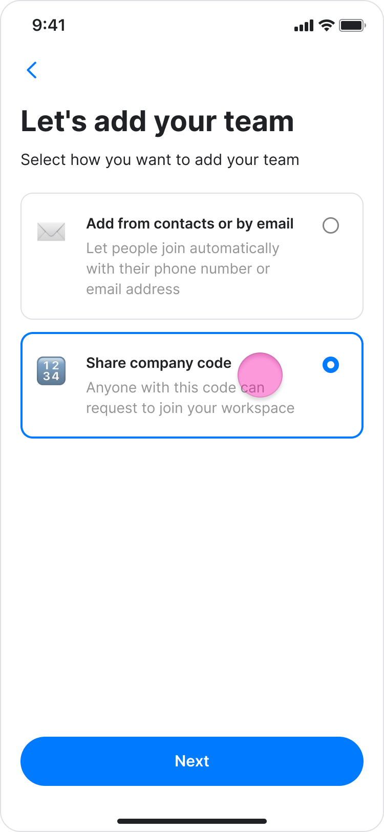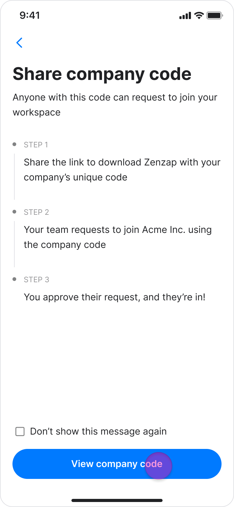 An admin can activate a company code to share with new team members. When new members enter this code during onboarding, workspace admins will receive a request which they must approve before the team member can join (see: Approving Join Request).