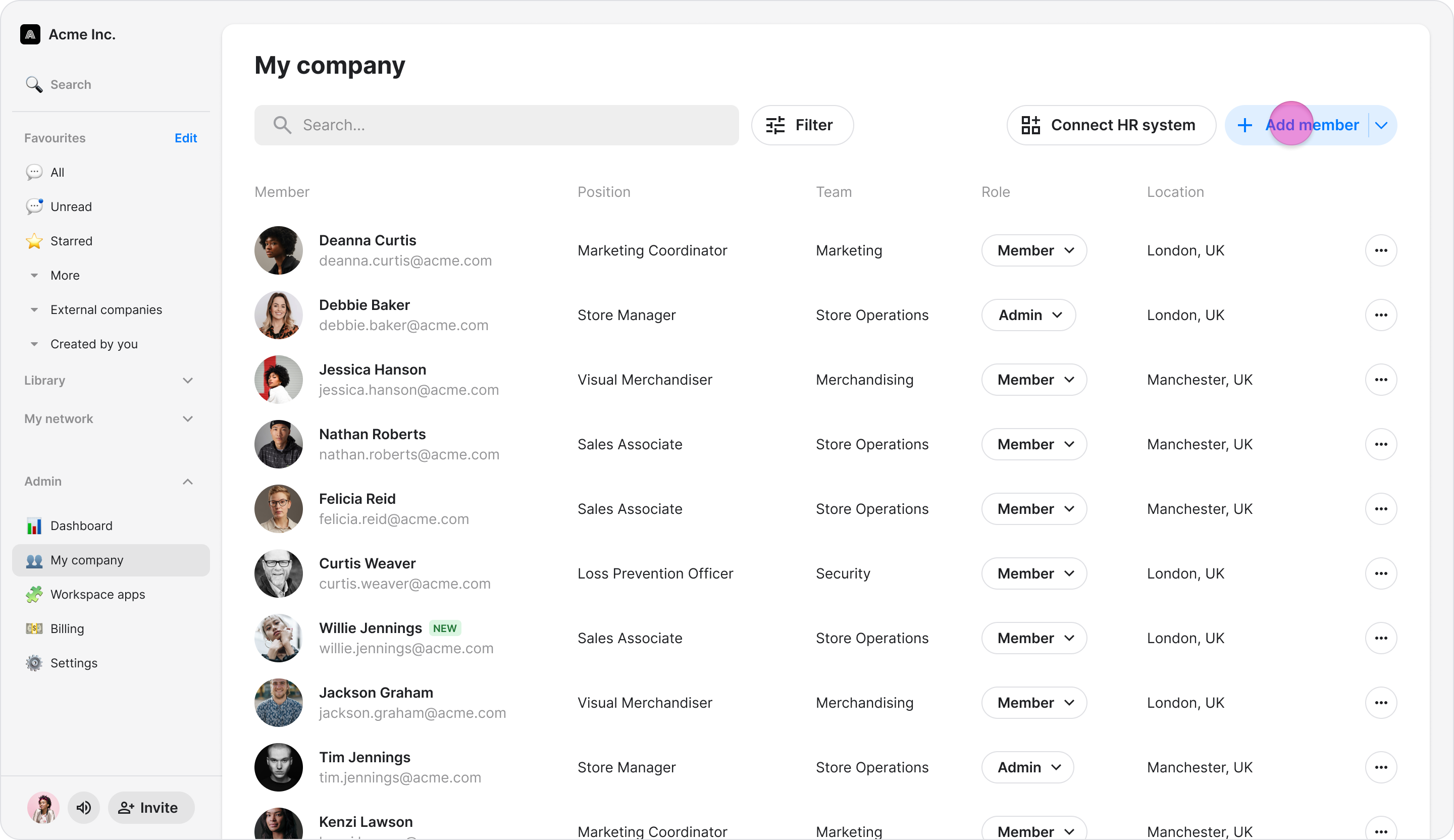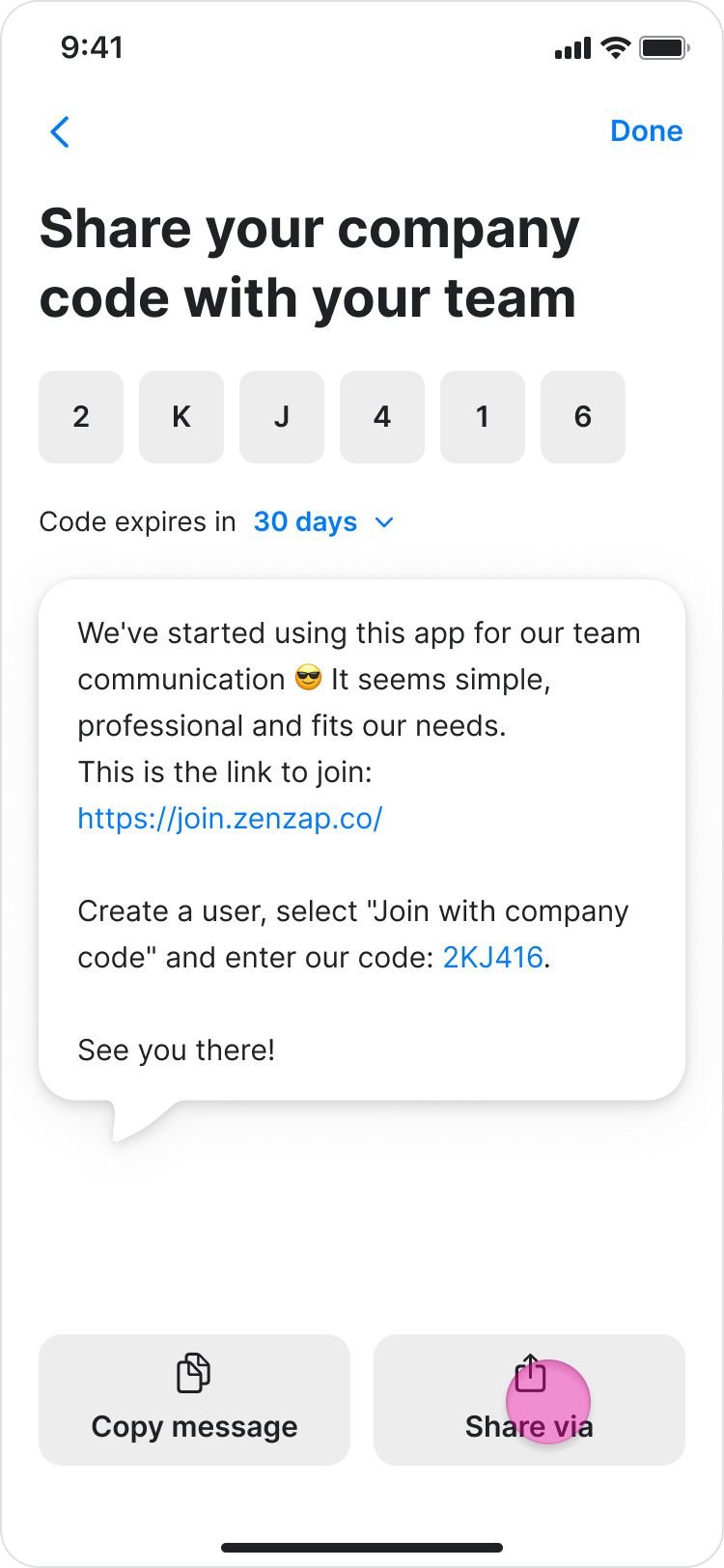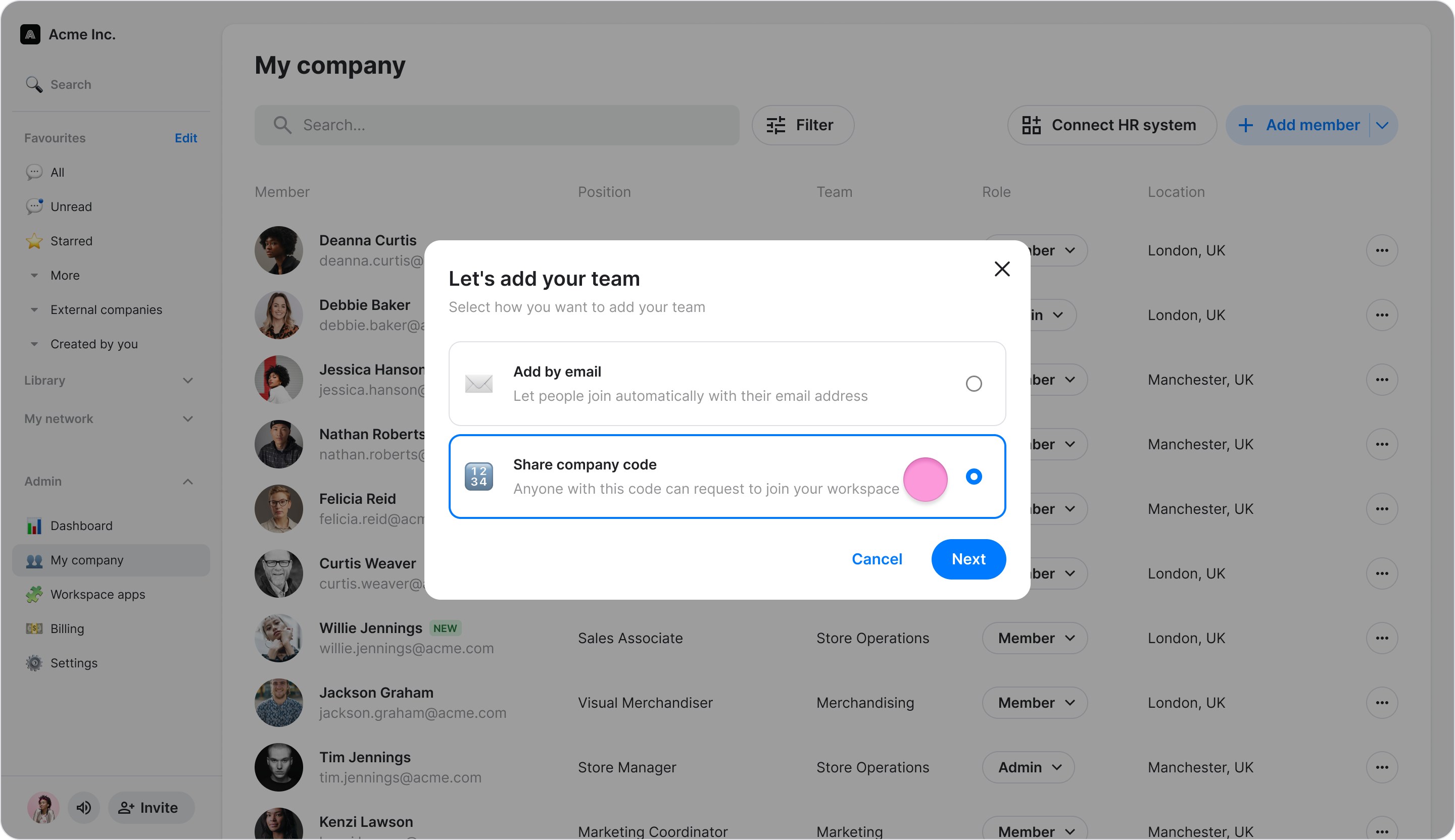 An admin can activate a company code to share with new team members. When new members enter this code during onboarding, workspace admins will receive a request which they must approve before the team member can join (see: Approving Join Request).