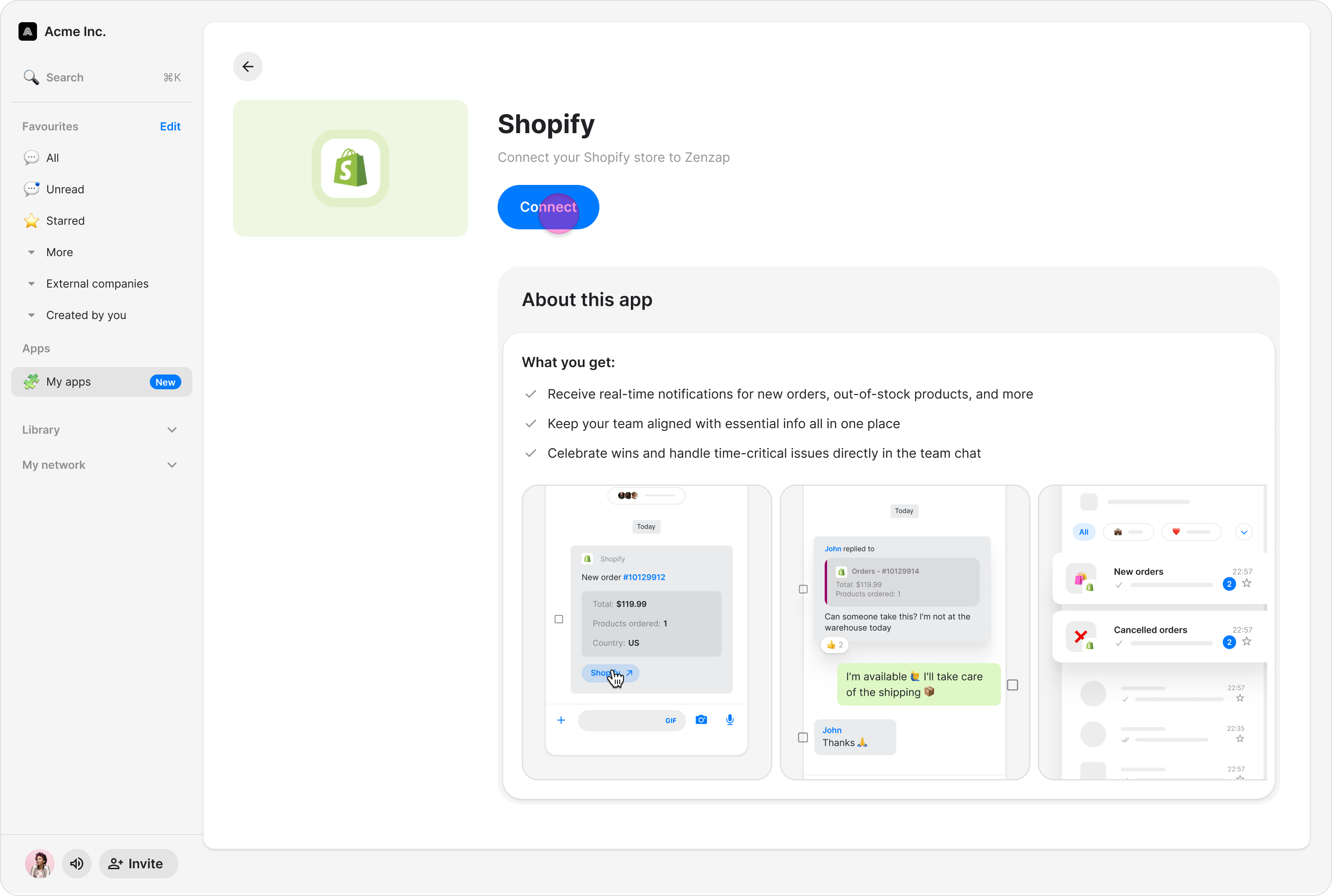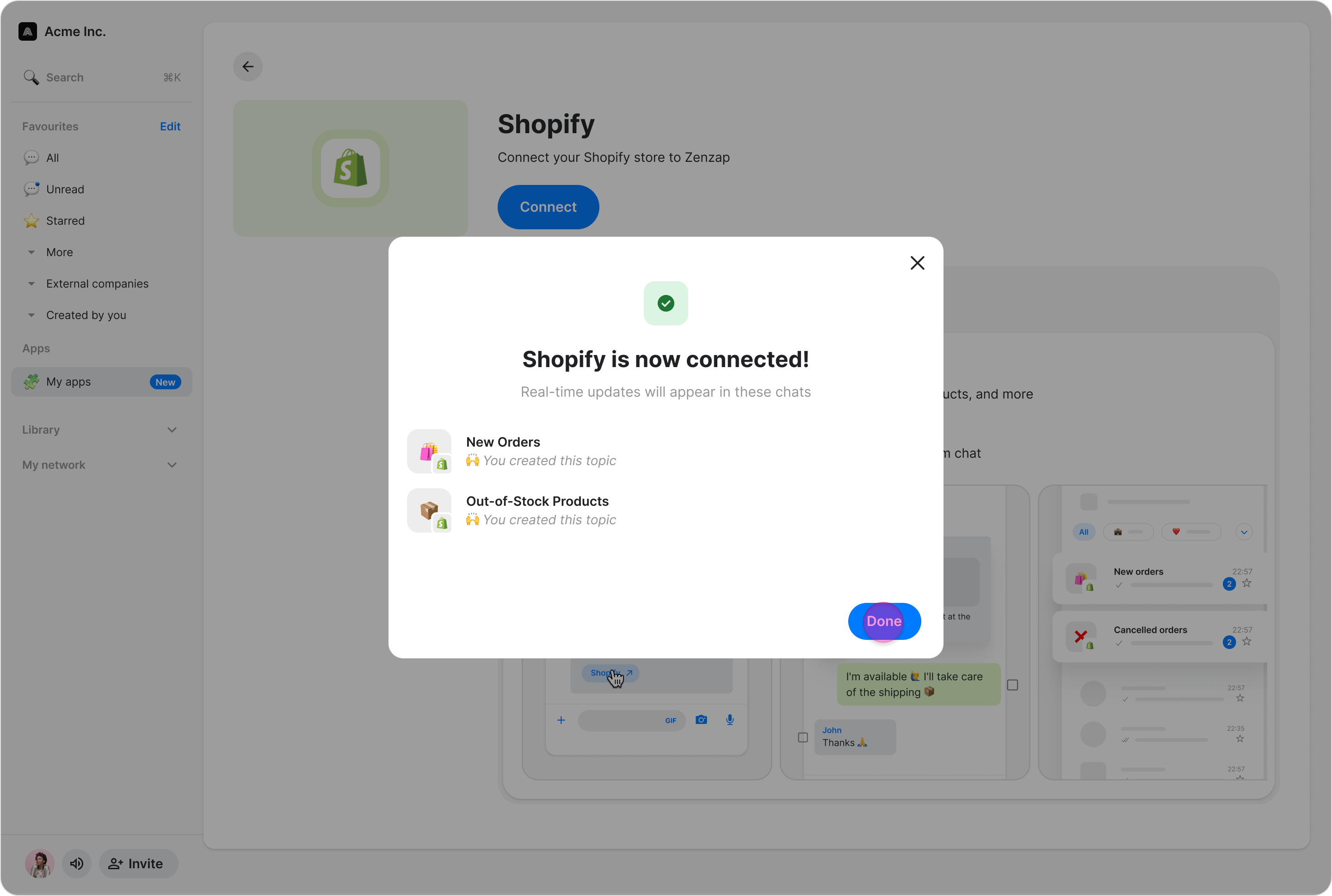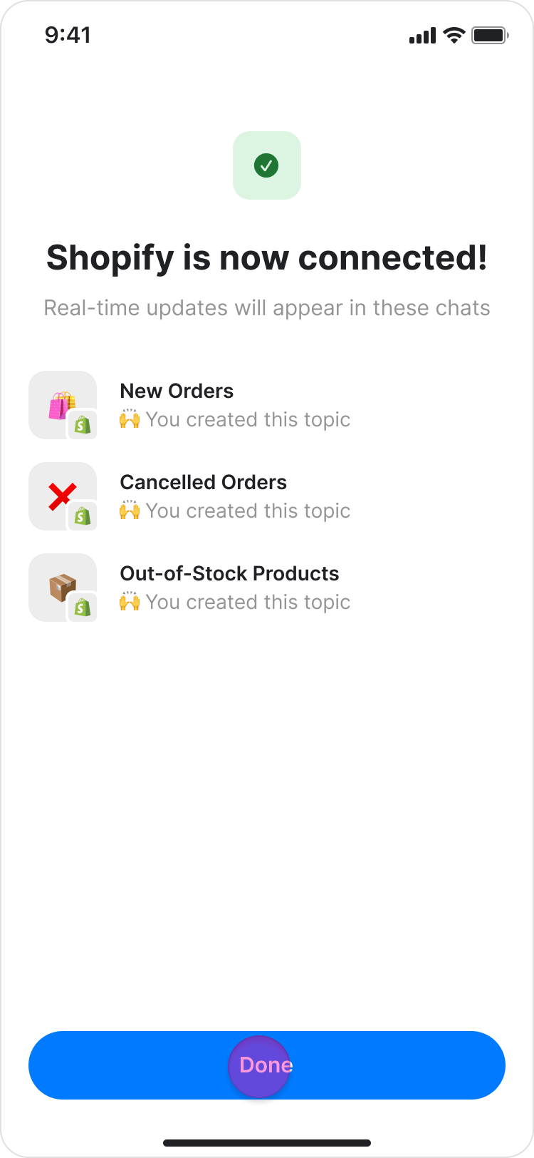Connect your Shopify store to Zenzap to receive real-time notifications for new orders, out-of-stock products, and more in dedicated chats.