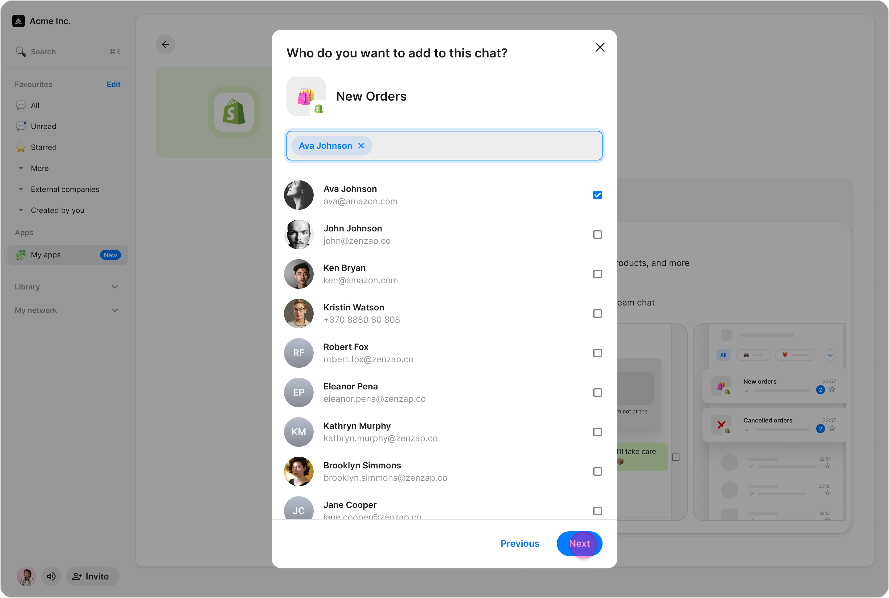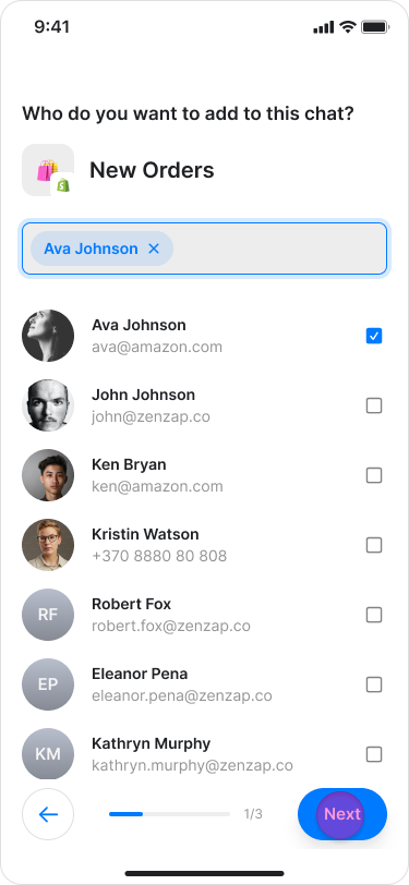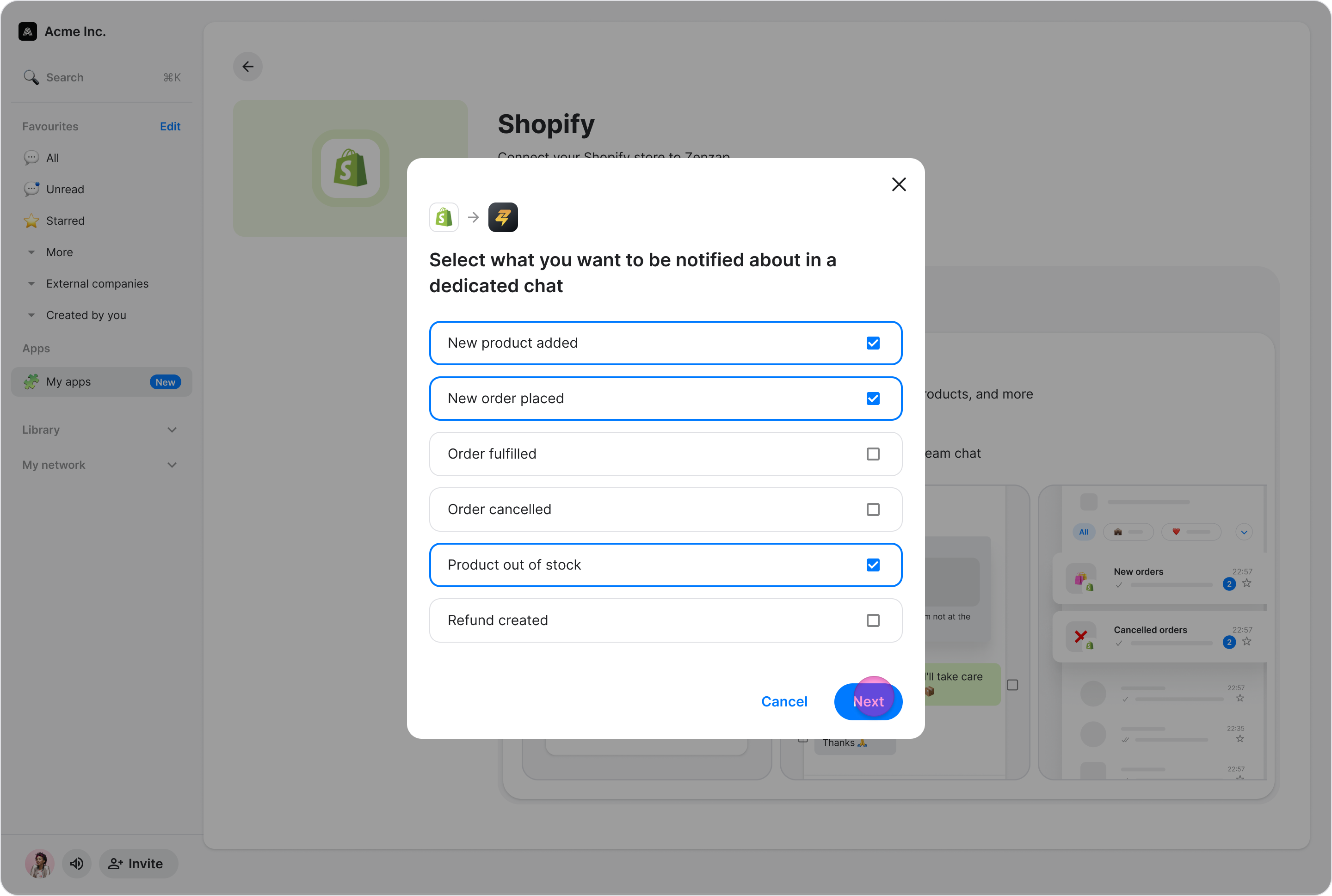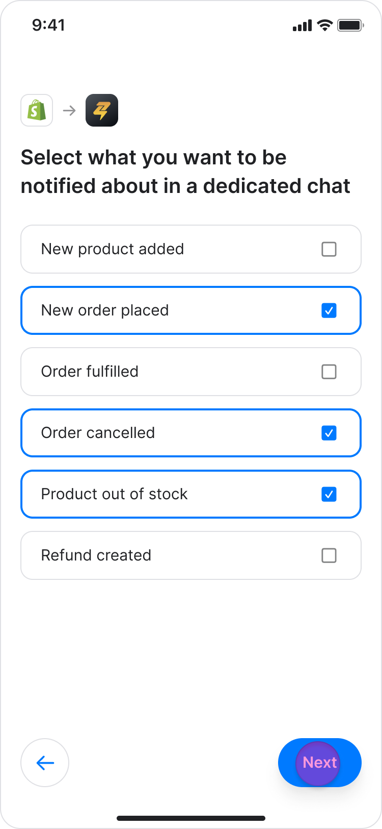 Connect your Shopify store to Zenzap to receive real-time notifications for new orders, out-of-stock products, and more in dedicated chats.