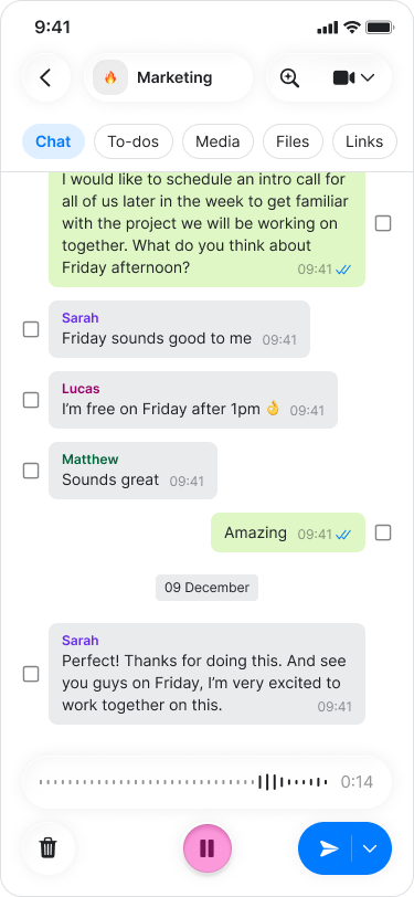 To preview a recording before sending, tap "Pause" and then tap "Play".