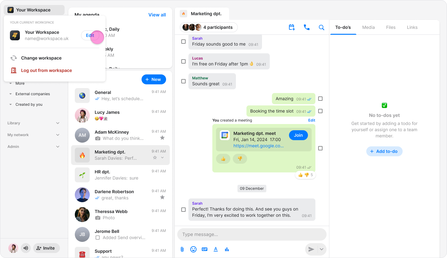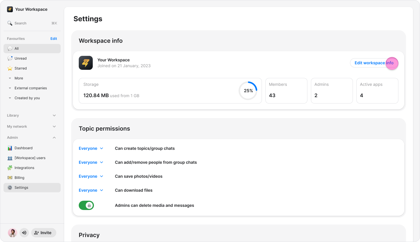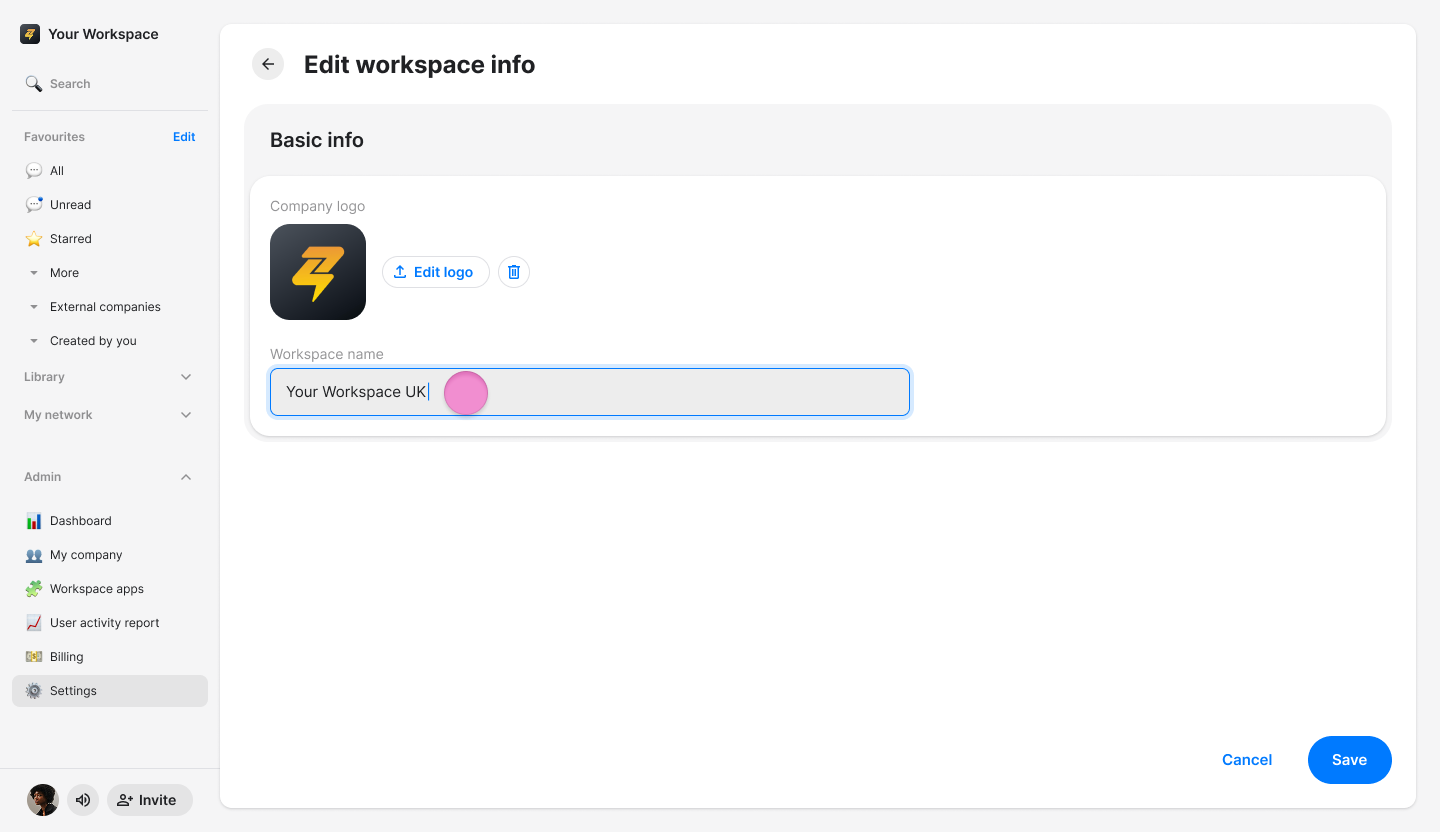 Note: You can also change the workspace name by going to the "Admin" tab, tapping "Edit" at the top-right corner, and following steps 3 and 4.