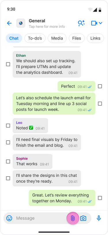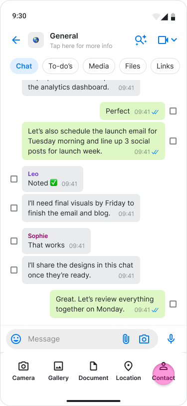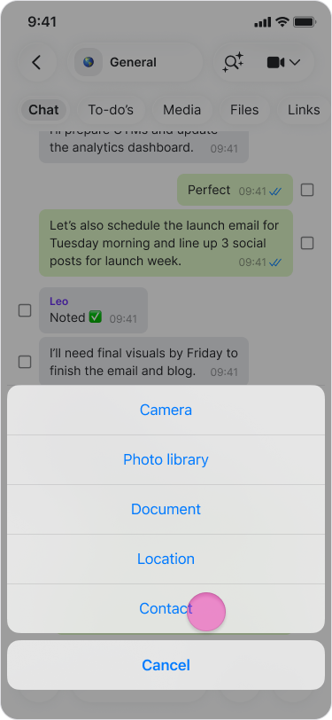 Share your phone contacts directly from your chats to keep your team informed and connected.