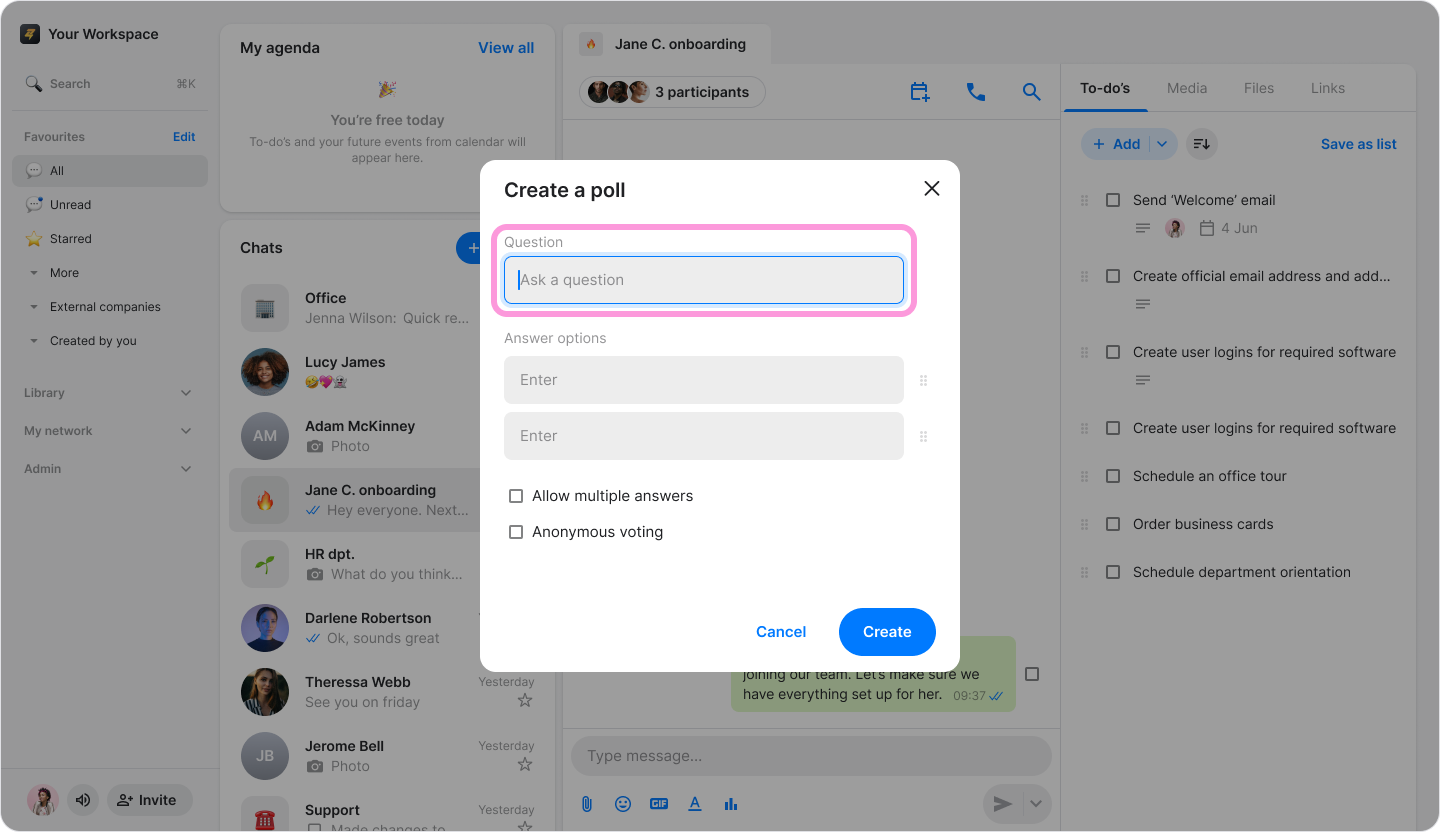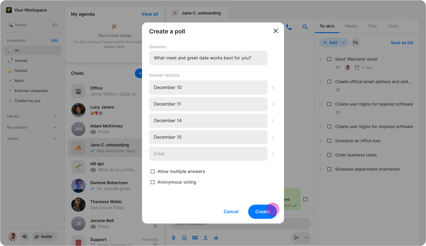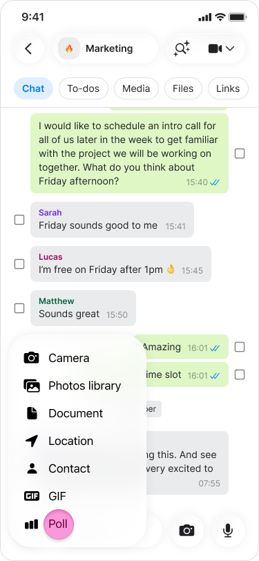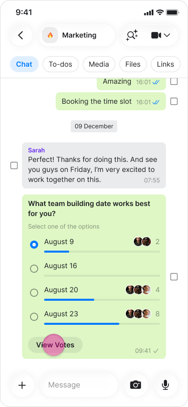 Gather instant feedback from your team by creating interactive polls directly within any conversation.