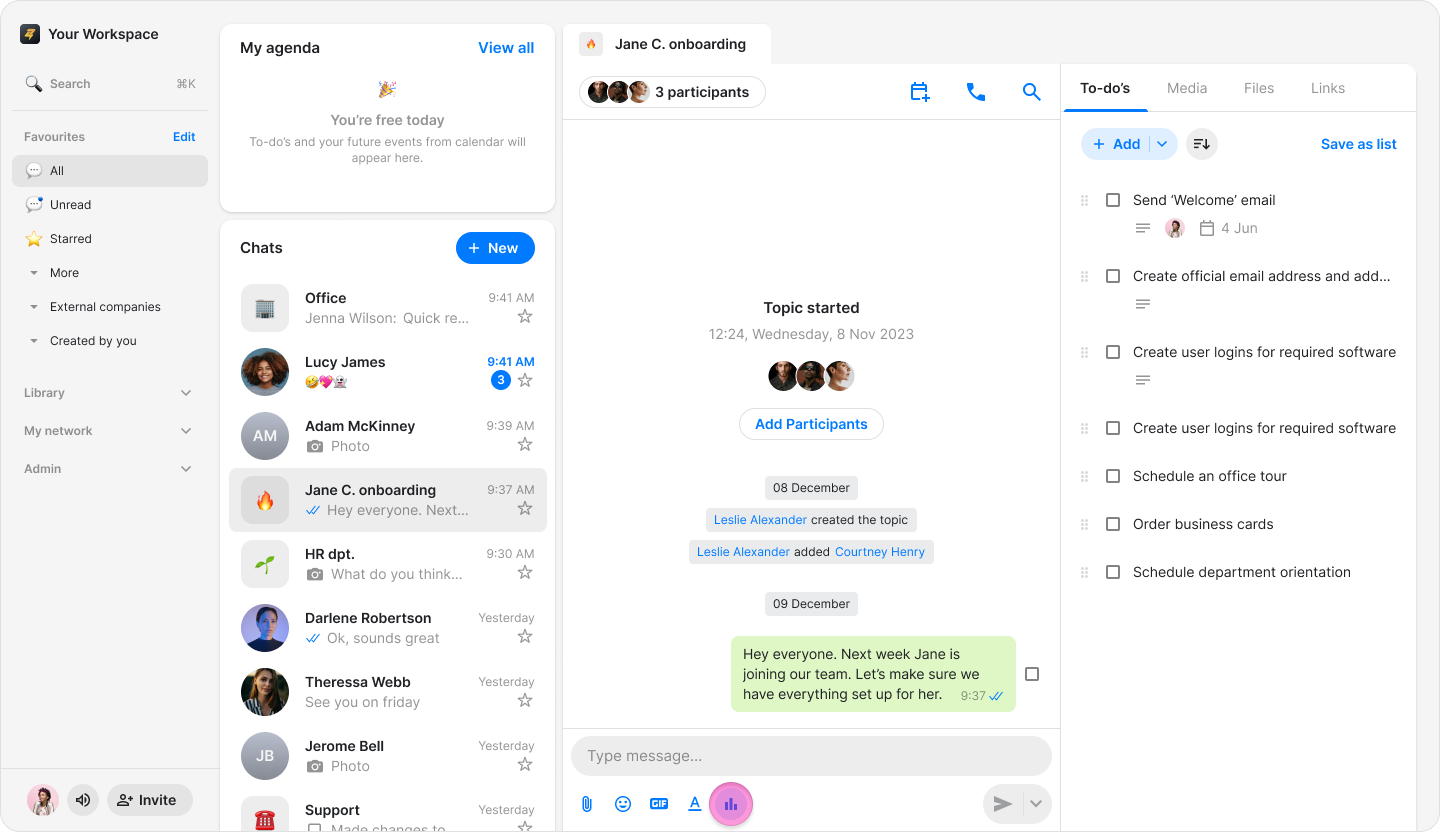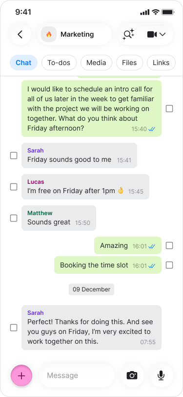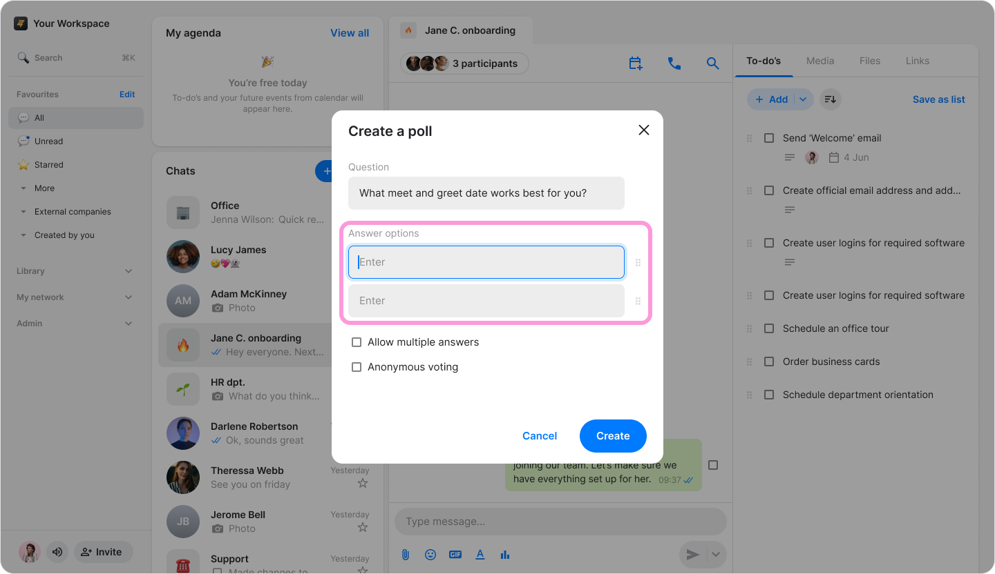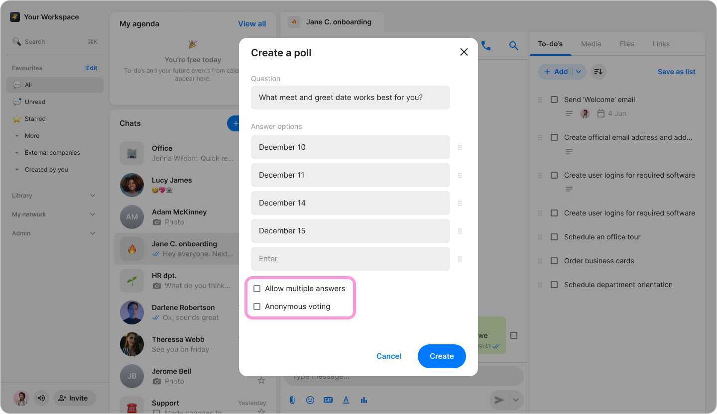 Gather instant feedback from your team by creating interactive polls directly within any conversation.