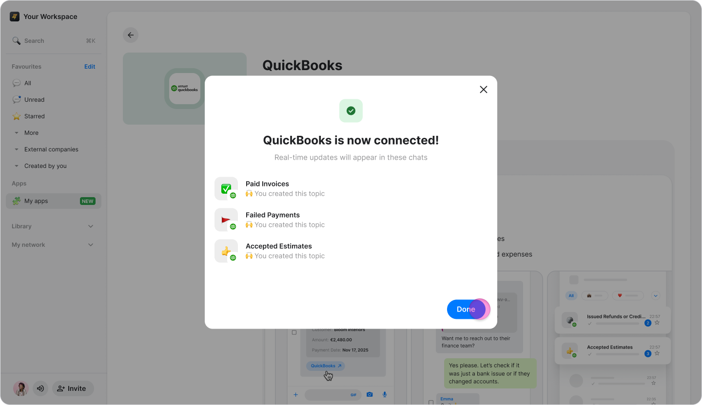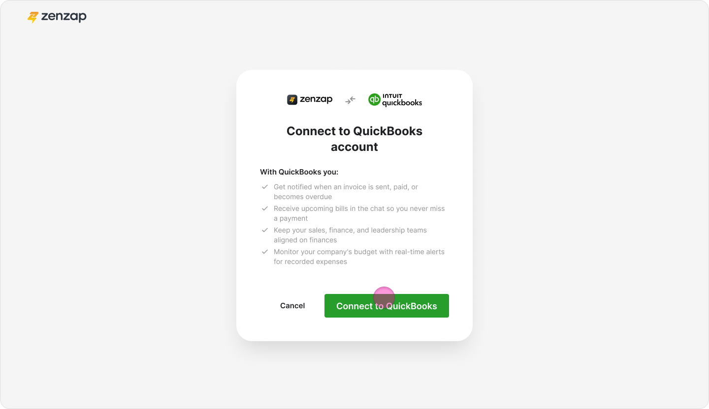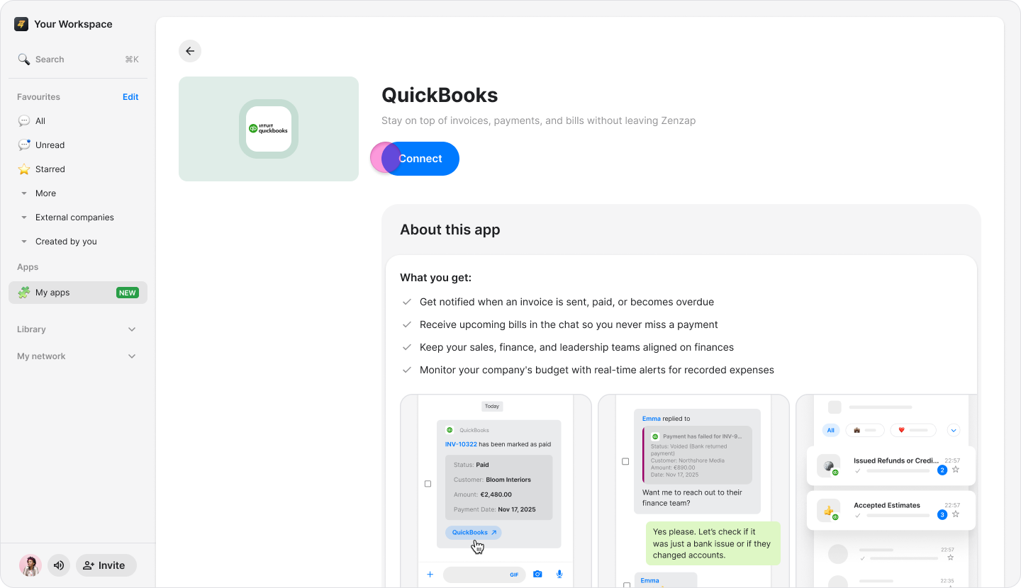 Connect your QuickBooks account to Zenzap to receive real-time notifications about payments, invoices, and expenses in dedicated chats.