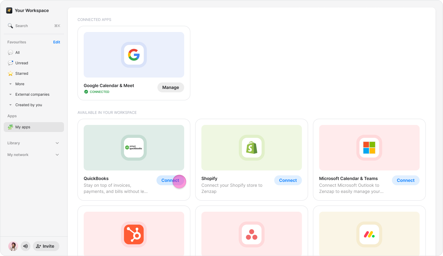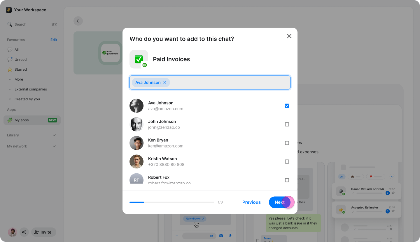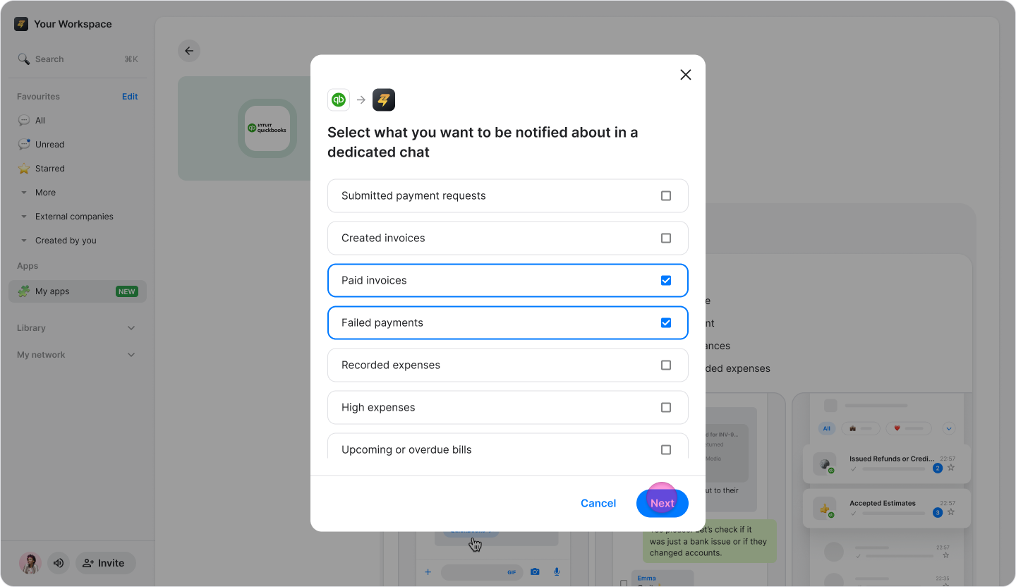 Connect your QuickBooks account to Zenzap to receive real-time notifications about payments, invoices, and expenses in dedicated chats.