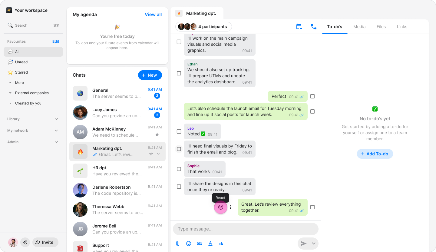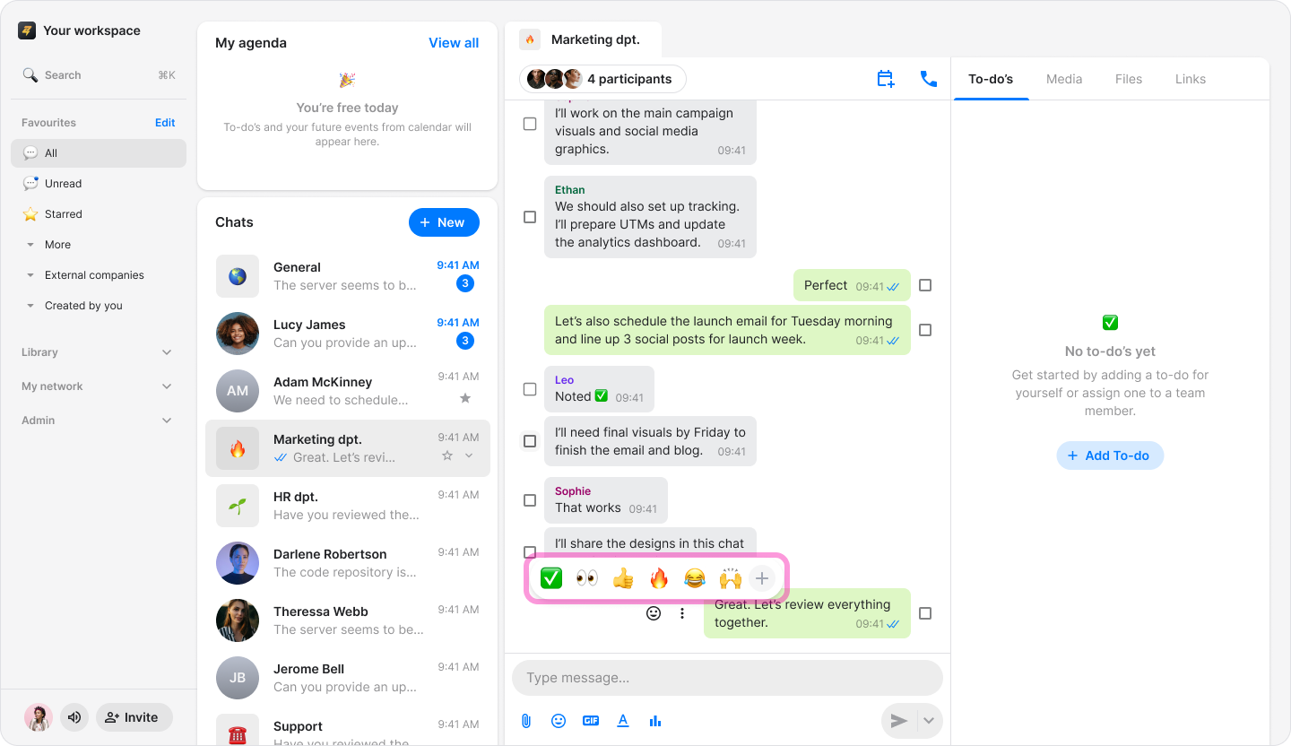 Quickly respond to messages in chats, topics, and announcement by adding an emoji reaction.