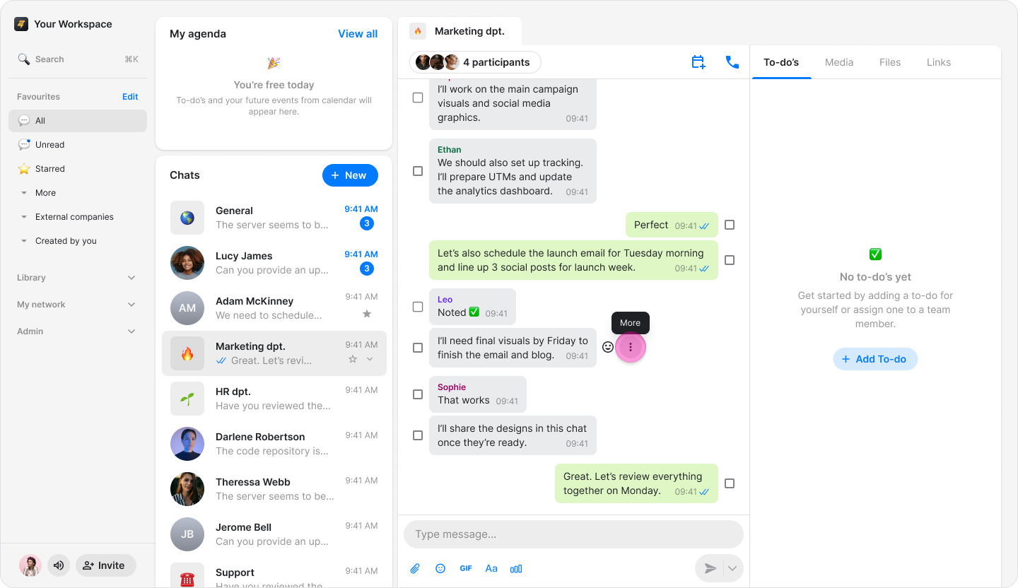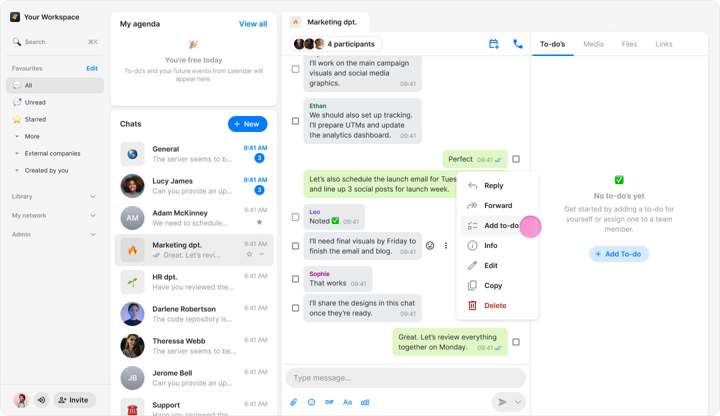 Note: These items function as regular to-dos and appear in the "To-dos" tab of your chosen chat.