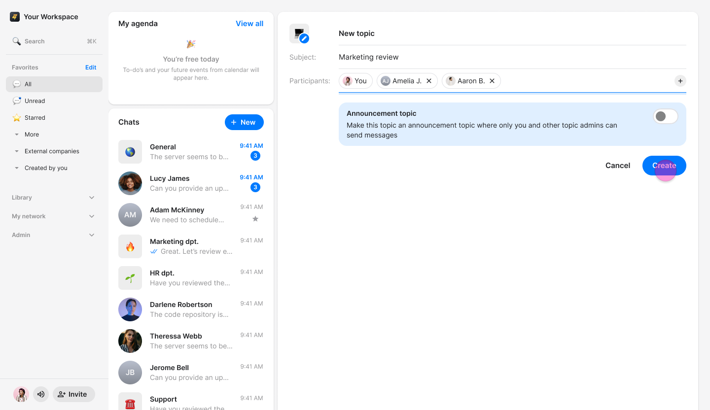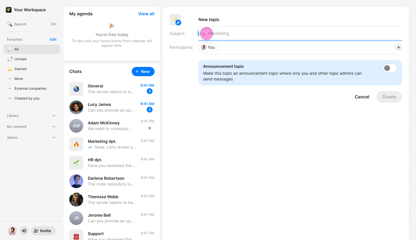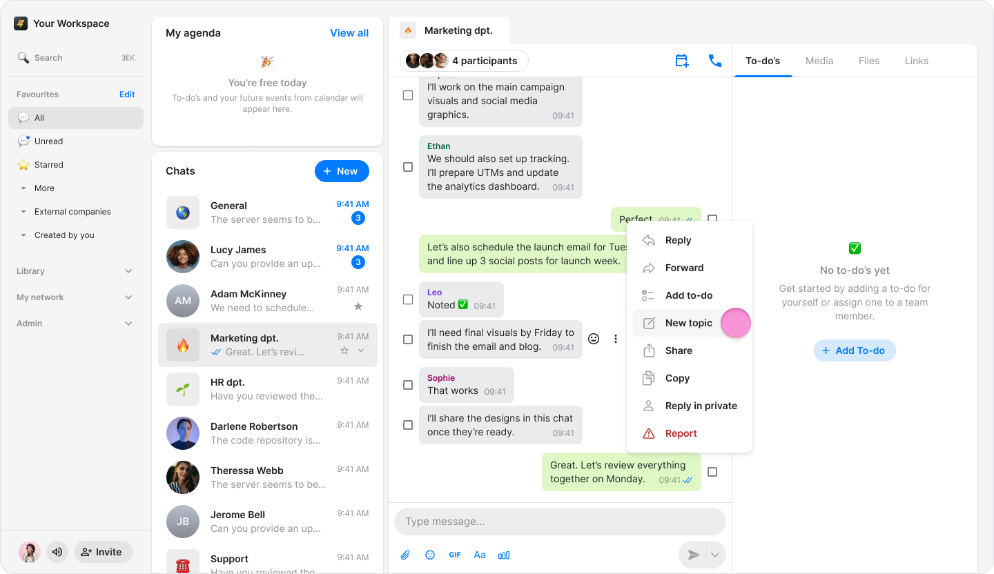 Turn any existing message into a new topic to keep your projects and teams organized.