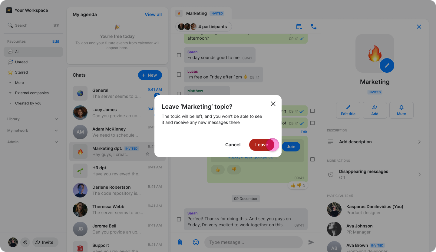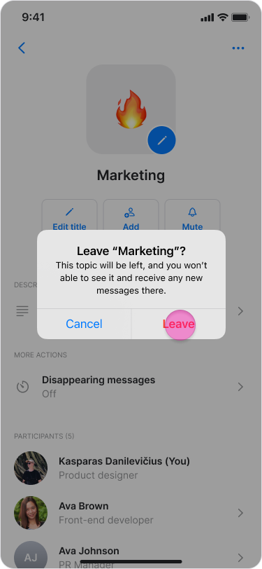 In your message list, you can slide a chat left and tap "Leave topic" or long-press the chat and select "Leave the topic".