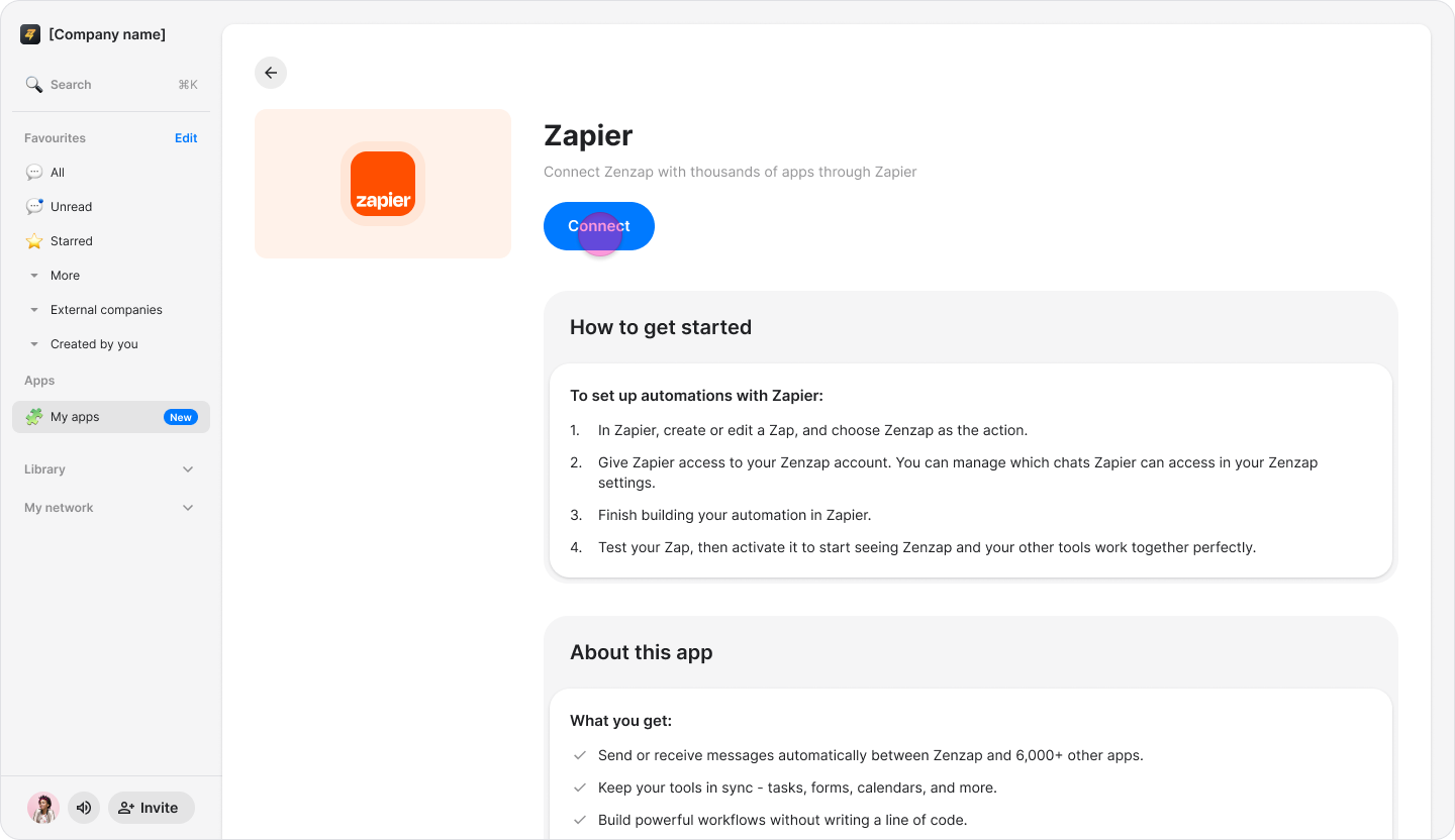 Click "Connect" to link Zenzap with Zapier.