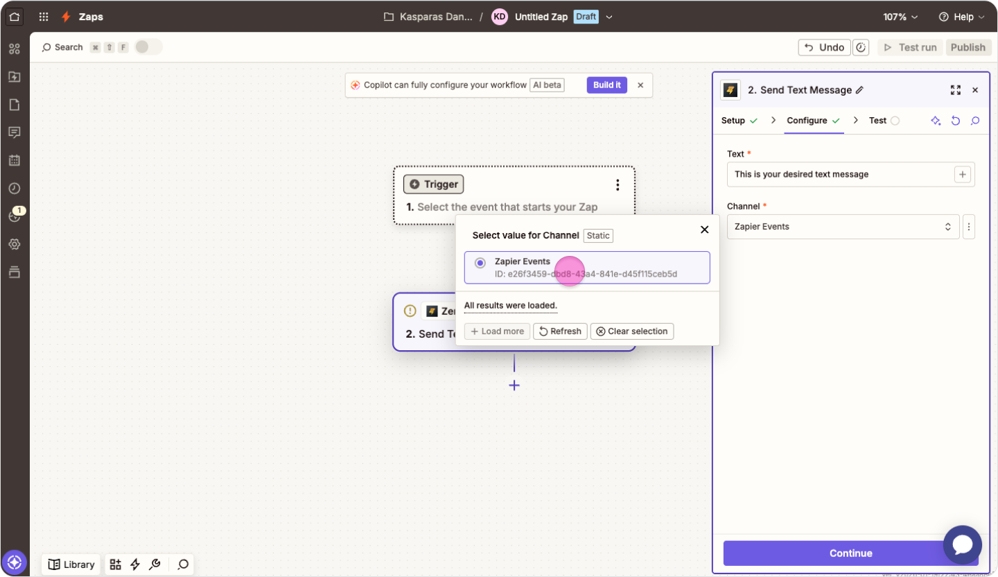To send dynamic content based on previous Zap steps, use the "/" Zapier feature to incorporate those results into your message.