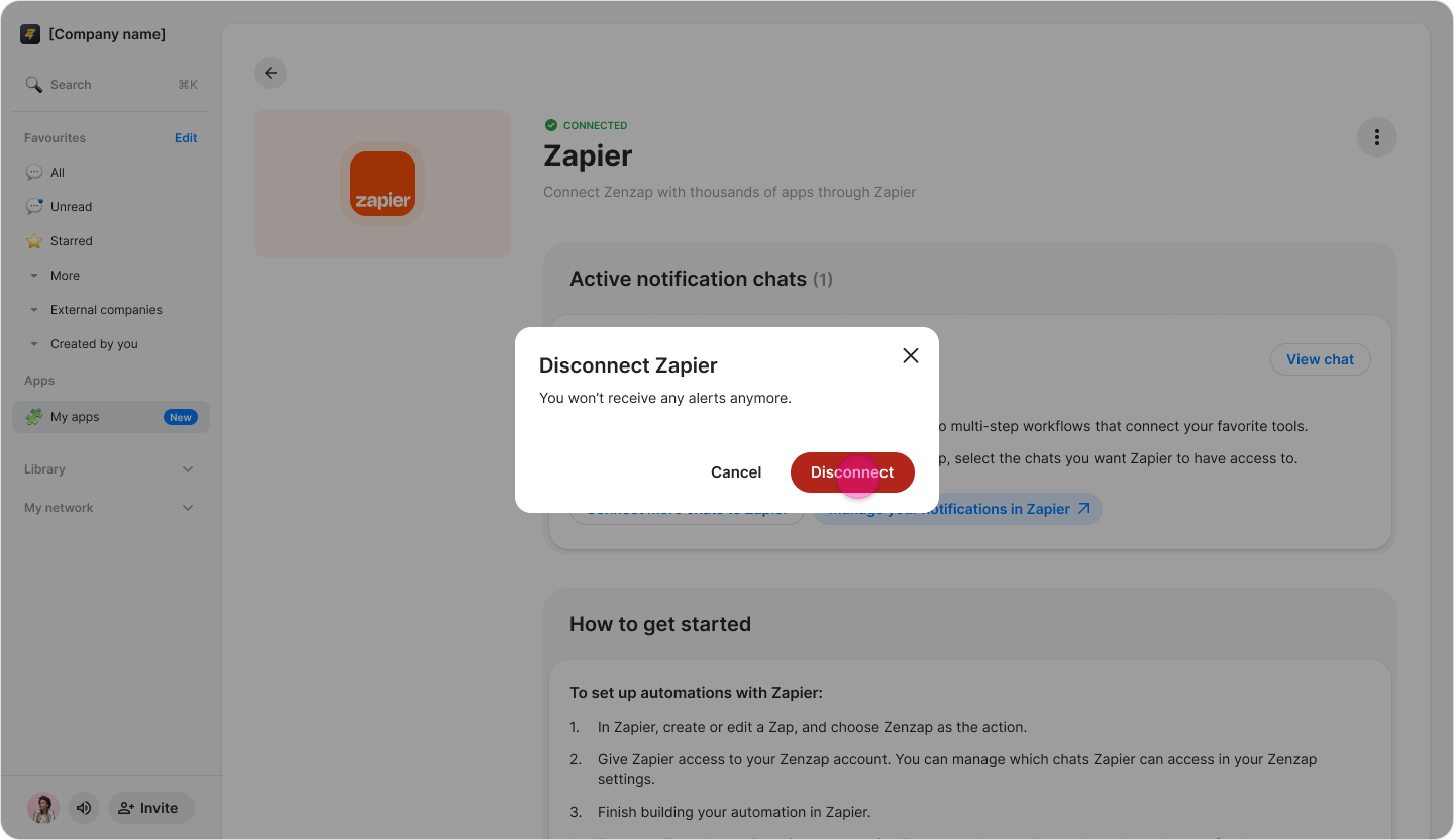 Note: Disconnecting the app stops all Zapier-based notifications and removes Zapier’s permissions to view your workspace. Existing messages will not be removed.