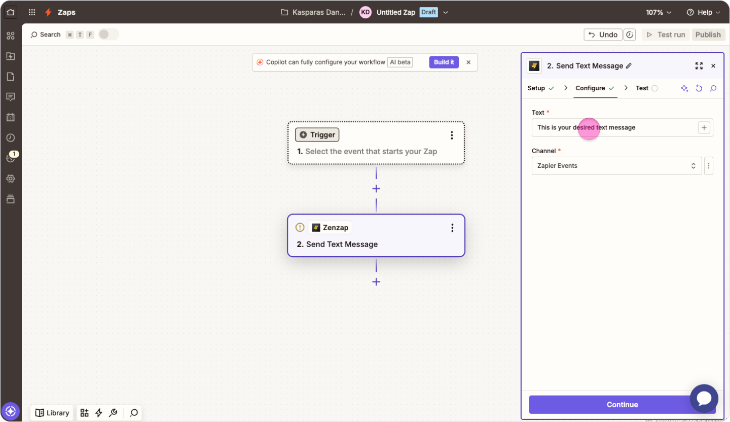 Choose "Send Text Message" in the "Action event" box and click "Continue".