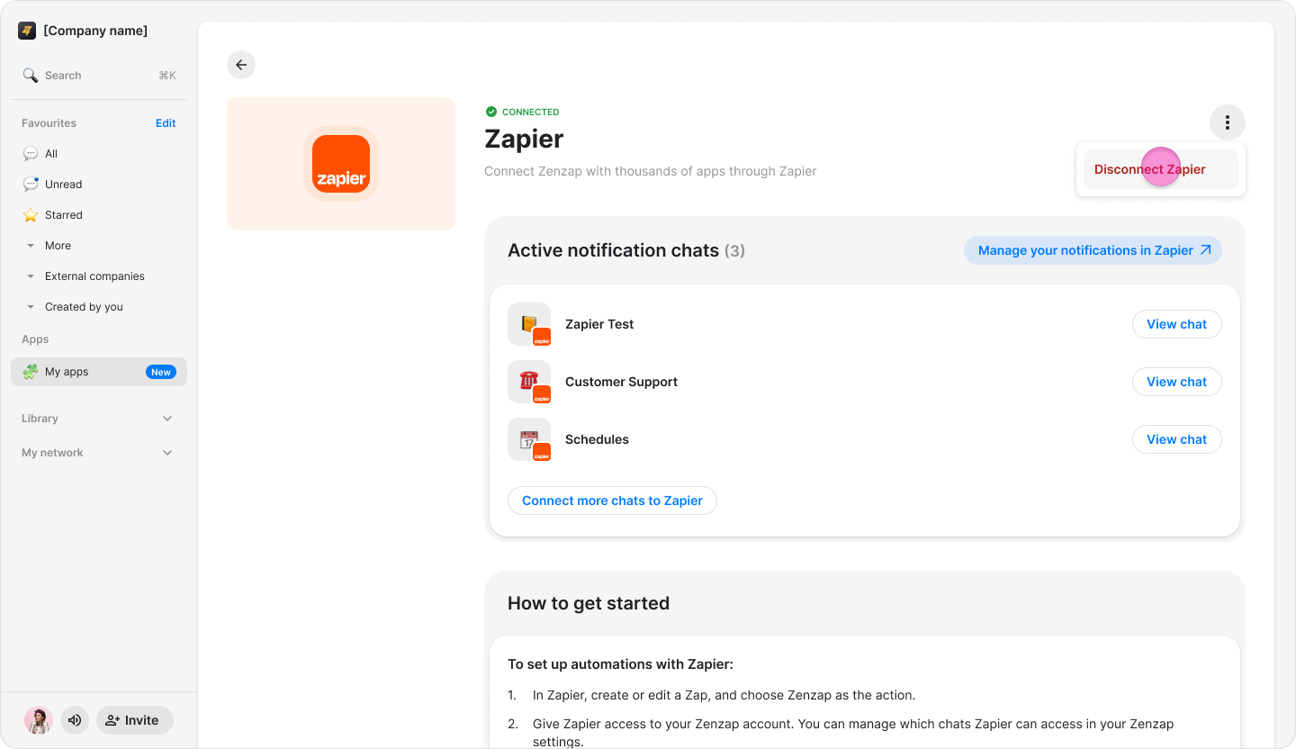 Note: Disconnecting the app stops all Zapier-based notifications and removes permissions. Existing messages will not be removed.